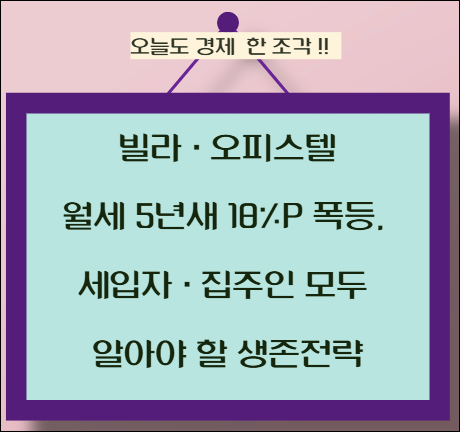 | 💰 가격 동향 | 서울 오피스텔 평균 월세 90만원 → 91만6,000원 상승 / 40~60제곱미터 중소형 상승폭 2.3% 최대 / 1~2인 가구 수요 집중 / 빌라 전세-월세 전환율 5% 수준 유지 / 📈 수익형 부동산으로 재평가 중 |