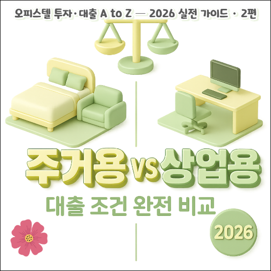 📚 오피스텔 투자·대출 A to Z — 2026 실전 가이드 · 2편🏢 같은 오피스텔인데 왜 대출 조건이 다를까?주거용 vs 상업용 완전 비교