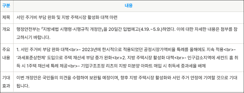 행정안전부는 서민의 주거비 부담을 완화하기 위한 대책으로 「지방세법 시행령‧시행규칙 개정안」을 4월 19일부터 5월 9일까지 20일간 입법예고했습니다. 이번 개정안에는 다음과 같은 내용이 포함되어 있습니다.