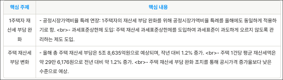 첫째, 2023년에 한시적으로 적용되었던 공정시장가액비율 특례를 올해에도 지속 적용합니다. 이에 따라 3억 원 이하 주택은 43%, 3억 원 초과 6억 원 이하 주택은 44%, 6억 원 초과 주택은 45%의 공정시장가액비율이 적용됩니다. 둘째, '과세표준상한제'를 올해 처음 시행하여 주택 재산세 과세표준 증가를 전년 대비 5% 수준으로 제한함으로써 주택 보유자의 재산세 부담 증가를 완화할 수 있을 것으로 기대됩니다.