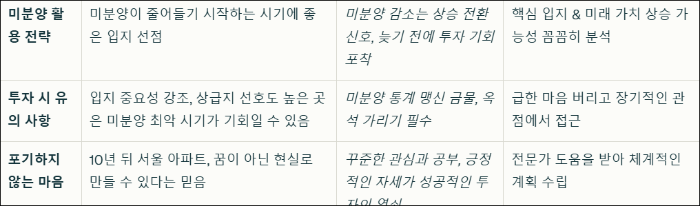 부동산 시장 상황이 어렵다고 해서 섣불리 포기하지 마세요. 지금 당장 '상급지'에 내 집 마련을 하지 못하더라도 좌절할 필요는 없습니다. 10년이라는 시간은 충분히 긴 시간이며, 꾸준히 관심을 갖고 공부하며 준비한다면 서울 아파트를 포함하여 원하는 곳에 내 집 마련의 꿈을 이룰 수 있습니다. 중요한 것은 급한 마음을 버리고, 자신의 상황에 맞춰 할 수 있는 것부터 시작하는 것입니다. 현재 시장 상황을 냉철하게 분석하고, 미래 가치를 내다볼 수 있는 안목을 키운다면, 악성 미분양 시대에도 성공적인 내 집 마련을 이룰 수 있습니다.