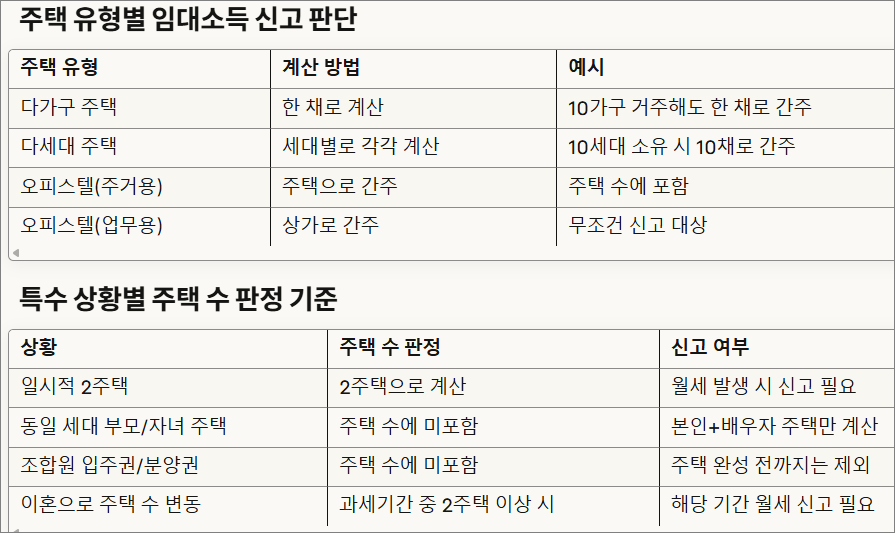 이는 취득세나 양도소득세 계산과는 다른 기준으로, 주택으로 완성되기 전까지는 단지 권리로만 간주되어 주택수에서 제외됩니다. 또한, 소형 주택도 월세 수입이 발생하고 2주택 이상을 보유한 경우에는 신고 대상이 됩니다. 소형 주택이 주택수에서 제외되는 경우는 오직 전세 보증금에 대한 간주임대료 과세 대상 여부를 판정할 때뿐입니다.