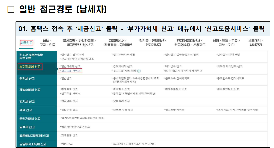 법인사업자들이 성실하게 부가가치세를 신고할 수 있도록 홈택스에서는 '신고도움 서비스'를 운영하며, 이를 통해 맞춤형 도움 자료를 제공합니다. 홈택스 접속 시 내비게이션을 통해 해당 서비스에 바로 접근할 수 있습니다.