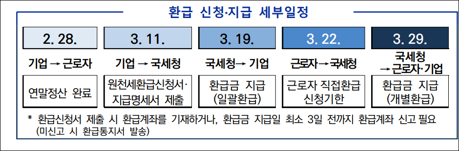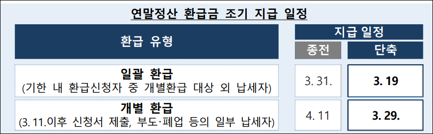 2024년 연말정산 환급금이 자금난을 겪는 납세자를 지원하기 위해 일정을 앞당겨 지급합니다. 일괄 환급 대상자는 3월 19일, 개별 환급 대상자는 3월 29일까지 환급금을 받게 됩니다. 환급금 지급을 위해서는 환급신청서 제출 시 환급계좌를 기재하거나, 지급일 최소 3일 전까지 환급계좌를 신고해야 합니다.