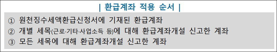 기업은 원천징수세액환급신청서 제출 시 환급계좌를 기재하거나, 홈택스를 통해 계좌개설 신고서를 제출해야 합니다. 세무대리인의 신고는 불가하며, 특정 은행 계좌는 환급받을 수 없습니다. 환급계좌는 신청 순서에 따라 적용되며, 체납이나 제출 미비 시 환급이 어려울 수 있습니다.