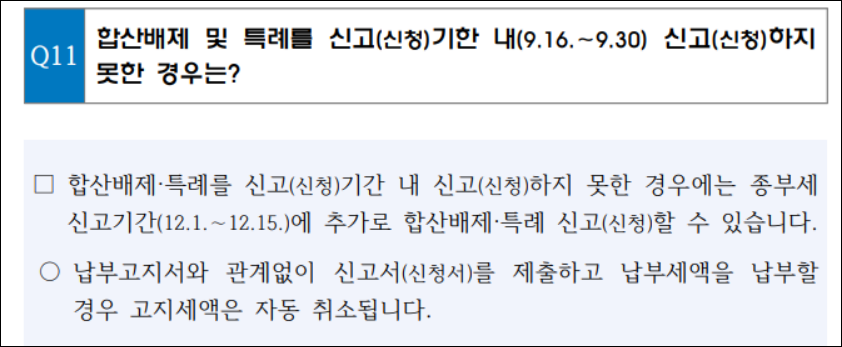 다음으로, 이들의 신청 및 취소 시기에 대해 이야기해보겠습니다. 합산배제 및 과세특례 신청은 원래 매년 9월 16~30일 사이에 이루어지지만, 이 기간을 놓친 경우에도 종부세 납부기한인 12월 1~15일 사이에 신청할 수 있습니다. 기존 신청 내역을 취소하는 것 역시 마찬가지입니다.
