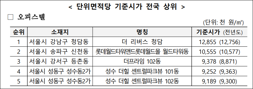 *[최고 기준시가 지역] - 오피스텔: '더 리버스 청담' (강남구, 12,855천원)