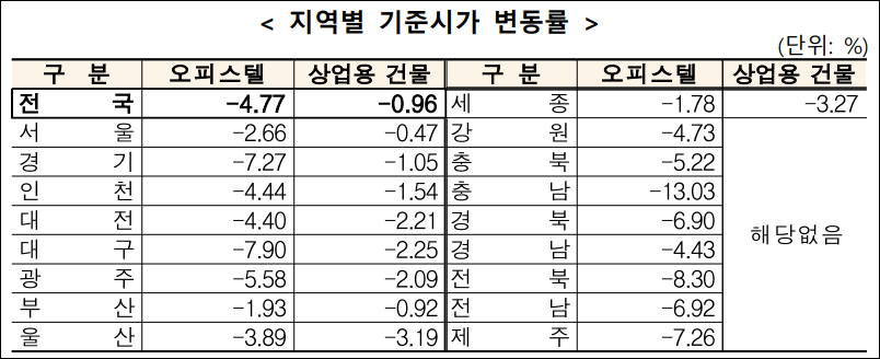 전년 대비 5.9% 증가 - 오피스텔 평균 하락률: 4.77%, 상업용 건물 평균 하락률: 0.96%