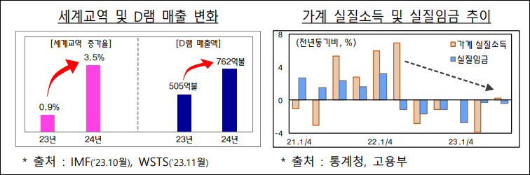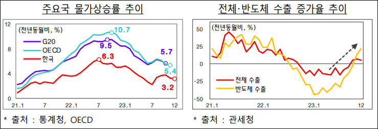 한편, 국내 경제는 반도체와 수출을 중심으로 회복세가 확대될 것으로 예상되지만, 고물가와 고금리의 장기화로 인한 소비의 둔화와 건설경기의 부진이 예상됩니다. 세계 교역과 반도체 업황의 회복으로 수출이 개선될 전망이지만, 부동산 경기의 하강과 건설 수주와 착공의 부진으로 건설 중심의 어려움이 예상됩니다. 또한, 고물가와 고금리 상황이 실질 소득 등의 소비 여력을 제약하며, 이에 따라 영세 소상공인과 지역경제 중심의 어려움이 가중될 것으로 보입니다.