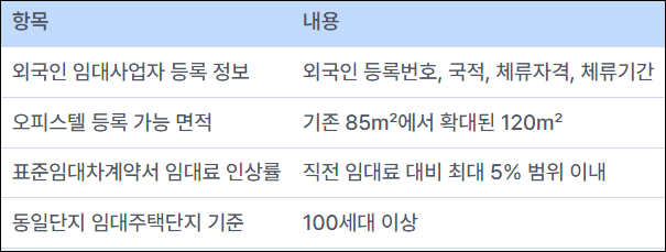 외국인 임대사업자 등록 시스템이 강화되어 이제 외국인 등록번호, 국적, 체류자격, 체류기간 등의 정보를 명시해야 합니다. 이는 외국인 임대사업자의 관리를 더욱 철저히 하기 위함입니다. 또한, 임대등록이 가능한 오피스텔의 전용면적 기준이 기존 85㎡에서 120㎡로 상향 조정되었습니다. 이는 바닥난방 설치가 가능한 오피스텔 면적 기준을 확대함으로써, 임대사업자와 임차인 모두에게 더욱 다양한 선택권을 제공하기 위한 조치입니다.