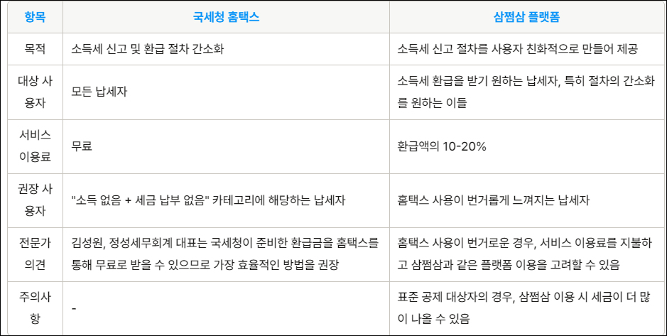 납세자가 홈택스를 사용하는 것보다 더 직관적인 화면에서 세금 신고를 하고 싶을 때, 삼쩜삼과 같은 세금환급 플랫폼의 도움을 받을 수 있습니다. 이러한 플랫폼들은 사용자가 더 쉽게 신고 절차를 진행할 수 있도록 도와주며, 이용의 편리함을 제공합니다. 하지만 이 편리함에는 환급금의 10~20%를 서비스 이용료로 지불해야 한다는 점을 고려해야 합니다. 따라서 납세자는 이용료를 절약할지, 아니면 돈을 지불하고서라도 더 편리한 서비스를 이용할지를 결정해야 합니다.