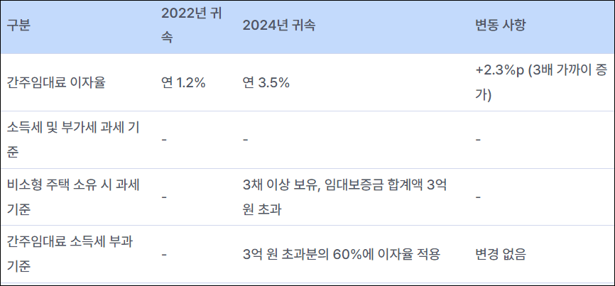 이자율 상승에 따른 세금 증가:** 이자율이 상승함에 따라, 간주임대료에 대해 과세되는 소득세와 부가가치세도 증가합니다. 이는 임대사업을 운영하는 데 있어 더 높은 세금 부담으로 이어지며, 임대사업자들은 이러한 변화에 주의를 기울여야 합니다.