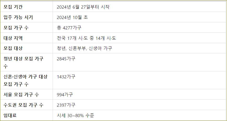 | 신청 방법 | - 신청은 2024년 6월 27일부터 시작되며, 한국토지주택공사(LH)의 청약플러스 누리집(apply.lh.or.kr)에서 청년 대상 1745가구와 신혼·신생아 가족 대상 1399가구의 매입임대주택 정보를 확인하고 신청할 수 있습니다. - 서울주택도시공사 등 각 기관별로 모집하는 매입임대주택 1133가구는 해당 기관별 누리집에서 확인 가능합니다. |