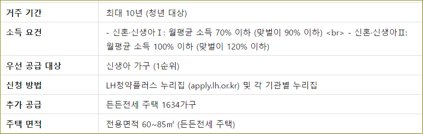 | 선정 절차 | - 자격 검증 등의 과정을 거쳐 이르면 2024년 10월 초부터 입주가 가능하며, 신청자격 및 소득 요건을 충족하는 경우 우선 입주자로 선정될 수 있습니다. - 특히 신생아 가구는 1순위 입주자로 우선 공급됩니다. |