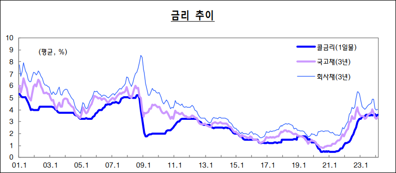 2024년 2월에는 국고채 금리가 일부 변동을 보였습니다. 미국 연방준비제도(Fed)의 조기 피벗 기대 약화로 인해 국고채 금리가 상승하였으나, 이후 2월 하순에는 다시 하락하는 추세를 보였습니다. 채권 시장의 변동은 주식 시장과는 다소 상반된 움직임을 보여주며, 이는 시장 참가자들의 투자 전략에 영향을 미칠 수 있습니다.
