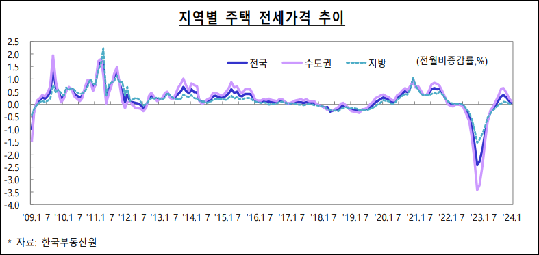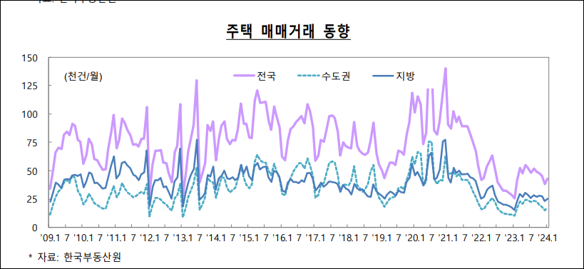 2024년 2월, 대한민국의 부동산 시장에서는 전국적으로 주택 가격이 하락하였으며, 특히 수도권과 지방 모두에서 하락세를 보였습니다. 한편, 전국적인 주택 전세가격은 상승하였습니다. 토지 시장에서는 전국적으로 토지 가격이 상승하고 거래량도 증가하였습니다. 이러한 부동산 시장의 움직임은 정부의 부동산 정책 등에 따라 변동될 수 있으며, 부동산 시장의 안정성을 위한 정책 개발이 필요합니다.