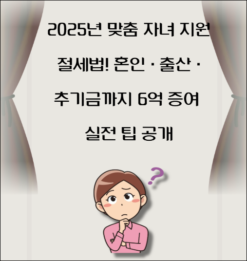 자녀에게 집 사거나 결혼 준비할 때 부담 없이 증여하는 현실적인 방법, 정말 궁금하지 않으세요? 🎁 이 글에서 세금 걱정 없는 6억 증여 노하우와 혼인, 출산, 추기금 활용까지, 직접 실천 가능한 절세 전략을 친절하게 안내해드립니다! 🌈 클릭 한 번으로 자녀 부자 만드는 비결, 지금 확인해보세요!