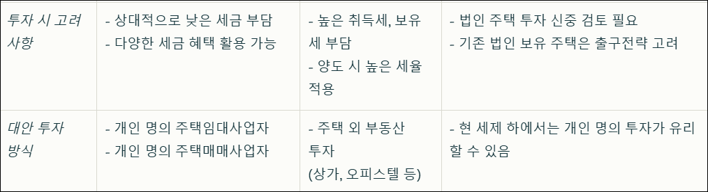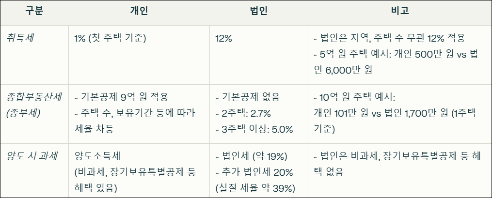 *주의사항*: 법인 주택은 장기 보유 시 매년 종부세 부담이 누적됩니다. 특히 추가 법인세는 단기 투자 시에도 높은 부담을 유발하니 철저한 수익 분석이 필수입니다.