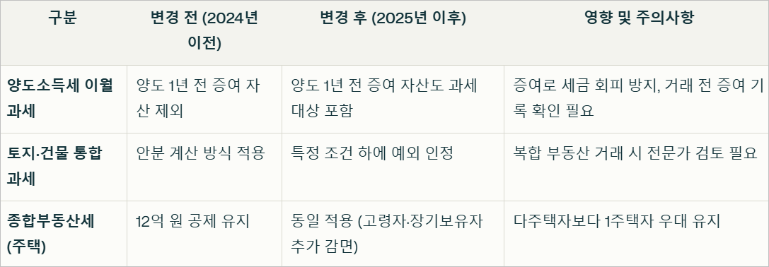 2025년부터 부동산 세금 제도가 크게 변화합니다. 양도소득세 이월과세 적용 대상 확대, 종합부동산세 구조 유지, 비업무용 토지 중과세율 면제 기간 연장 등 다양한 개편 사항이 도입되며, 이는 개인과 기업 모두에게 중요한 영향을 미칠 것입니다. 이 글에서는 새로운 세제 변화와 절세 전략을 알기 쉽게 설명하며, 부동산 시장 안정화와 관련된 핵심 정보를 제공합니다.