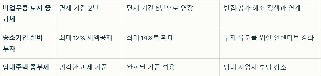 정부는 부동산 시장 안정화를 위해 다양한 세제 혜택과 규제를 병행하고 있습니다. 특히, 중소기업 및 중견기업의 설비 투자에 대해 최대 14%까지 투자세액공제를 제공하며, 임대주택 사업자에게는 종합부동산세 과세 기준을 완화했습니다. 이와 함께, 수도권 외 지역의 저가 주택은 '1가구 1주택' 기준 산정에서 제외되어 지역 균형 발전을 도모하고 있습니다.