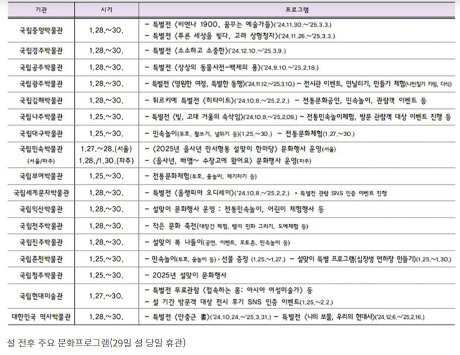 전국의 국립 박물관과 미술관에서도 설 연휴 동안 특별한 문화 프로그램이 마련되어 있습니다. 국립현대미술관에서는 특별전을 무료로 관람할 수 있으며, 국립국악원과 국립극장에서는 설 명절을 주제로 한 다양한 공연이 진행됩니다. 국립국악원에서는 29일에 '만사대길'이라는 종합예술공연이 열리며, 국립극장에서는 매일 1회 공연이 준비되어 있습니다. 또한, 국립아시아문화전당에서는 유튜브 채널을 통해 다양한 문화콘텐츠를 공개합니다.
