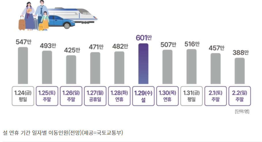 예상 통행량: 국토부는 이번 연휴 동안 약 3482만 명이 귀성 및 귀경길에 나설 것으로 예상하고 있으며, 설 당일인 29일에는 최대 601만 명이 이동할 것으로 보입니다