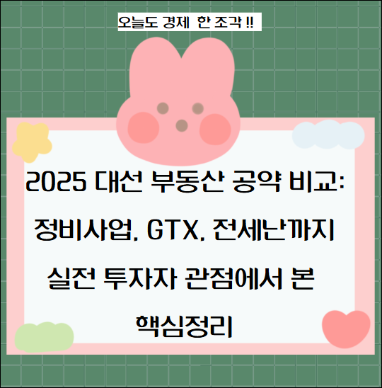 이번 대선에서 누가 대통령이 되든, 대한민국 부동산 정책의 큰 흐름은 정비 사업 활성화와 공급 확대, GTX 등 교통망 확충에 맞춰질 가능성이 높습니다. 세제나 대출 등 실질적인 시장 영향 정책은 아직 구체화되지 않았으므로, 실수요자라면 구축 아파트 매입에 대한 부담을 과도하게 가질 필요는 없으며, 특히 서울 등 대도시의 경우 정비 사업에 따른 환경 개선 효과도 기대할 수 있습니다. 임대 시장 불안이 지속되는 만큼, 전세 시세를 꾸준히 확인하고, 임대료 상승이 내집 마련을 앞당길 신호가 될 수 있다는 점을 기억해야 합니다. 대선 결과에 흔들리기보다, 시장의 실제 데이터를 바탕으로 합리적인 결정을 내리는 것이 가장 현명한 선택이 될 것입니다.