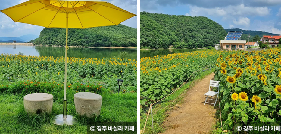 경주 바실라 카페는 하동저수지 옆에 자리한 한옥카페로, 경주시 건축상 동상을 수상한 멋진 공간입니다. 카페 주변에는 너른 해바라기 밭이 조성되어 있어 여름철 경주 여행의 필수 코스로 손꼽힙니다.