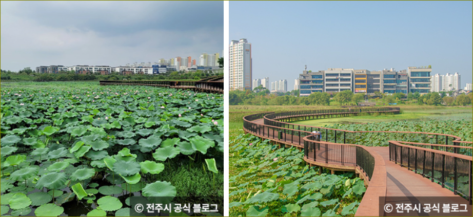 전주 기지제 수변공원은 덕진구 혁신동과 만성동에 걸쳐 조성된 공원으로, 호수 가운데로 데크가 조성되어 있어 여유로운 산책을 즐기기 좋습니다. 특히 7월에는 데크길 양옆으로 연꽃이 피어나 물 위를 걷는 듯한 특별한 경험을 할 수 있습니다.