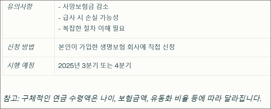 하지만 주의할 점도 있어요. 연금으로 전환하는 비율이 높아질수록, 나중에 가족에게 돌아가는 사망보험금이 줄어들 수 있다는 점을 꼭 기억해야 해요. 또, 예상보다 일찍 사망할 경우 손해를 볼 수도 있다는 점도 고려해야 하죠. 저는 이 제도를 활용하기 전에, 전문가와 충분히 상담하고 자신의 상황에 맞는 계획을 세우는 것이 중요하다고 생각합니다. 예를 들어, 연금 전환 비율을 신중하게 결정하고, 건강 상태와 기대 수명 등을 고려해야겠죠.