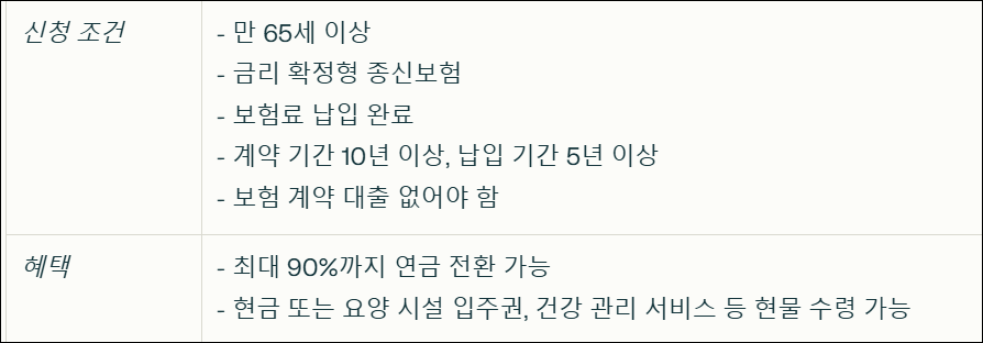 이 제도의 가장 큰 장점은 생전 자산 활용이 가능하다는 점입니다. 사망보험금의 최대 90%까지 연금으로 전환할 수 있으며, 나머지는 사망 시 유족에게 지급됩니다. 또한, 현금 대신 요양 시설 입주권이나 건강 관리 서비스 등 현물로 받을 수도 있어 선택의 폭이 넓습니다. 이자 부담 없이 경제적 안정성을 강화할 수 있는 이 제도는 맞춤형 설계가 가능해 개인의 상황에 맞게 활용할 수 있습니다.