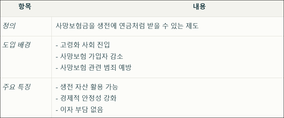 고령화 사회 진입과 사망보험 가입자 감소가 이 제도 도입의 주요 배경입니다. 65세 이상 노인 10명 중 1명 이상이 치매를 앓고 있으며, 매월 200만원에서 400만원의 돌봄 비용이 필요한 현실을 고려한 조치입니다. 신청 조건은 만 65세 이상으로, 금리 확정형 종신보험에 가입하고 보험료 납입이 완료된 상태여야 합니다. 계약 기간은 최소 10년 이상, 납입 기간은 5년 이상이어야 하며, 보험 계약 대출이 없어야 합니다. 본인이 가입한 생명보험 회사에 직접 신청할 수 있으며, 상속인의 동의는 필요하지 않습니다.