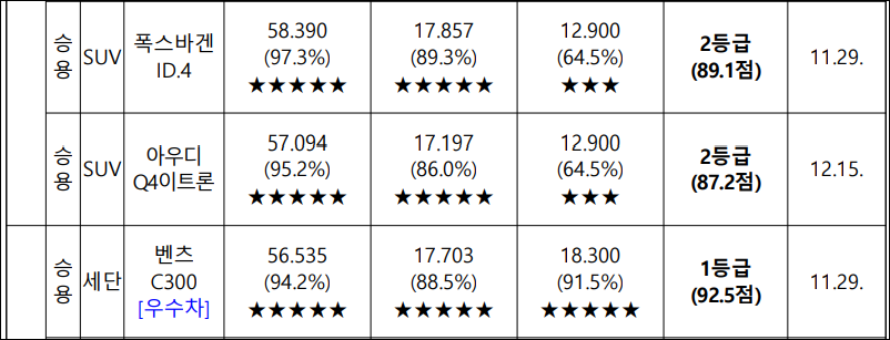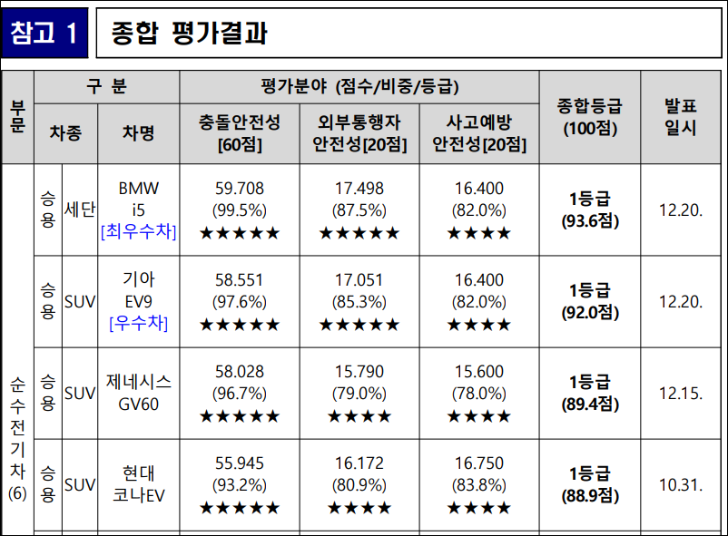 10개 평가 차종 중 BMW i5, 벤츠 C300, 기아 EV9, 제네시스 GV60, 현대 코나 EV, 현대 그랜저 등 6개 차종이 각 평가 분야에서 높은 점수를 얻어 1등급을 획득하였습니다. 아우디 이트론 Q4, 폭스바겐 ID.4, 쉐보레 트랙스 등 3개 차종은 사고예방 안전성 분야에서 2등급을, 도요타 RAV4는 3등급을 획득하였습니다.
